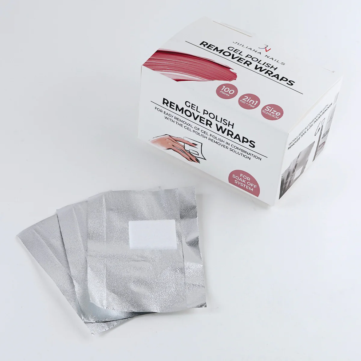 Bandes aluminium 10,5 x 74 mm avec une éponge intégré permettant de l’imprégner d’acétone et autre dissolvant.Envelopper le doigt en posant l’éponge imbibée sur le vernis semi-permanent à dissoudre, laisser poser 10 minutes et nettoyer.