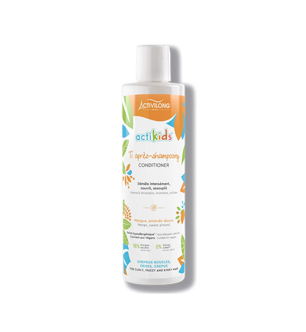 ACTIKIDS APRES SHAMPOOING convient aux cheveux ondulés, bouclés et crépus. Il aide à redéfinir les boucles et fait glisser les nœuds pour un démêlage plus facile. Avec des ingrédients naturels, ce conditioner tout doux respecte les cheveux fragiles de votre enfant :
