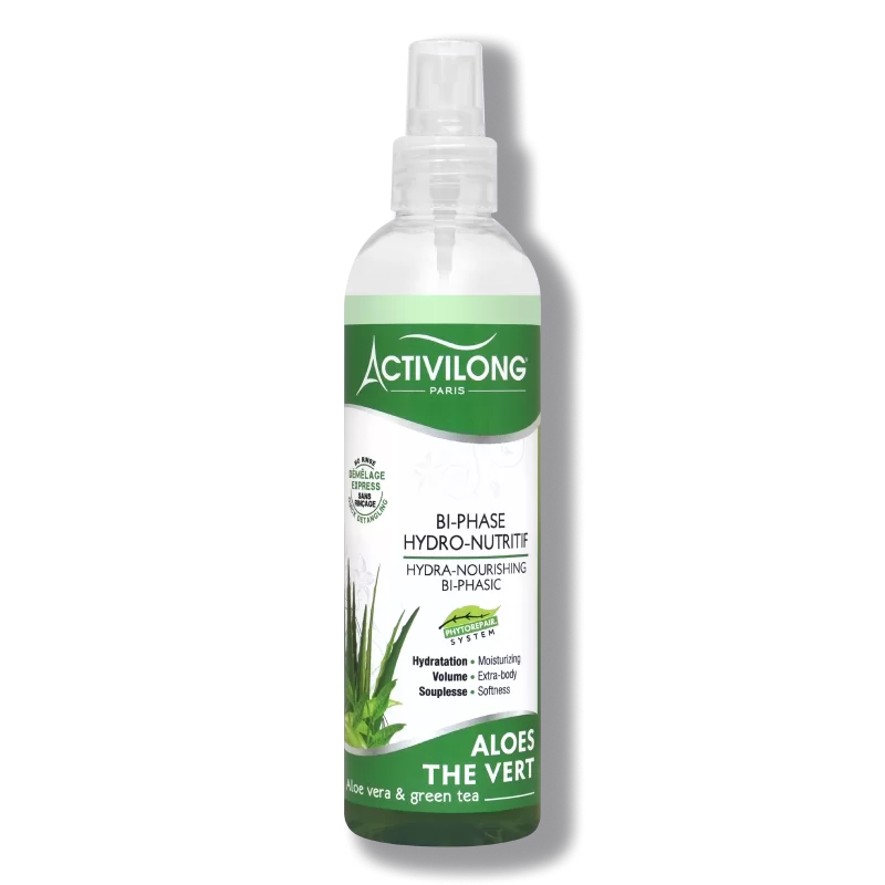 Le Spray Bi-Phase Hydronutritif, sans nécessité de rinçage, offre une action immédiate pour les cheveux abîmés et déshydratés. Sa texture légère se distingue par l’association harmonieuse des vertus hydratantes de l’Aloès et des propriétés revitalisantes du Thé Vert. Ce soin capillaire agit rapidement, apportant une hydratation profonde tout en réparant les dommages. L’Aloès, reconnu pour ses bienfaits hydratants, infuse les cheveux d’une vitalité retrouvée, tandis que le Thé Vert revitalise, créant une chevelure souple et brillante de santé. L’utilisation de ce spray bi-phase devient ainsi une étape incontournable pour une revitalisation capillaire immédiate, alliant l’efficacité hydratante à la puissance revitalisante pour des cheveux transformés et éclatants de vitalité.